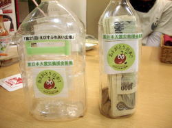 2011年は諸般の事情で某市の物産販売を見送ることとなり、山形県のPRと物産販売の話が浮上し関係機関と調整しましたが、東日本大震災の救援事情でなかなか思うように進められないこともあって、被災地応援のチャリティ・バザーで「えびすふれあい広場」に参加、義援金募集の「缶バッチ」を元気・まちネット会員のデザイナー指田さんにお願いして制作し、皆さんから提供していただいた商品の売上は総額24,000円にもなりました。その後、山形県でも募金を募り、合計¥30,000-を山形放送「愛の事業団」を通じて被災地へ届けました。