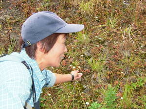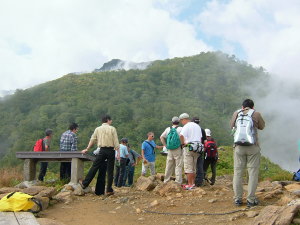 ガイドをしてくださった白馬マイスターの吉沢敏江さん。お歴々の参加者に少々戸惑い気味・・・(*^_^*)でしたが、解りやすく丁寧に高山植物や白馬の自然を説明してくださいました。 |