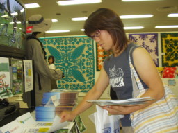 店番二人が一番盛り上がった山田誠司さんのビデオと一緒に記念撮影。 |
